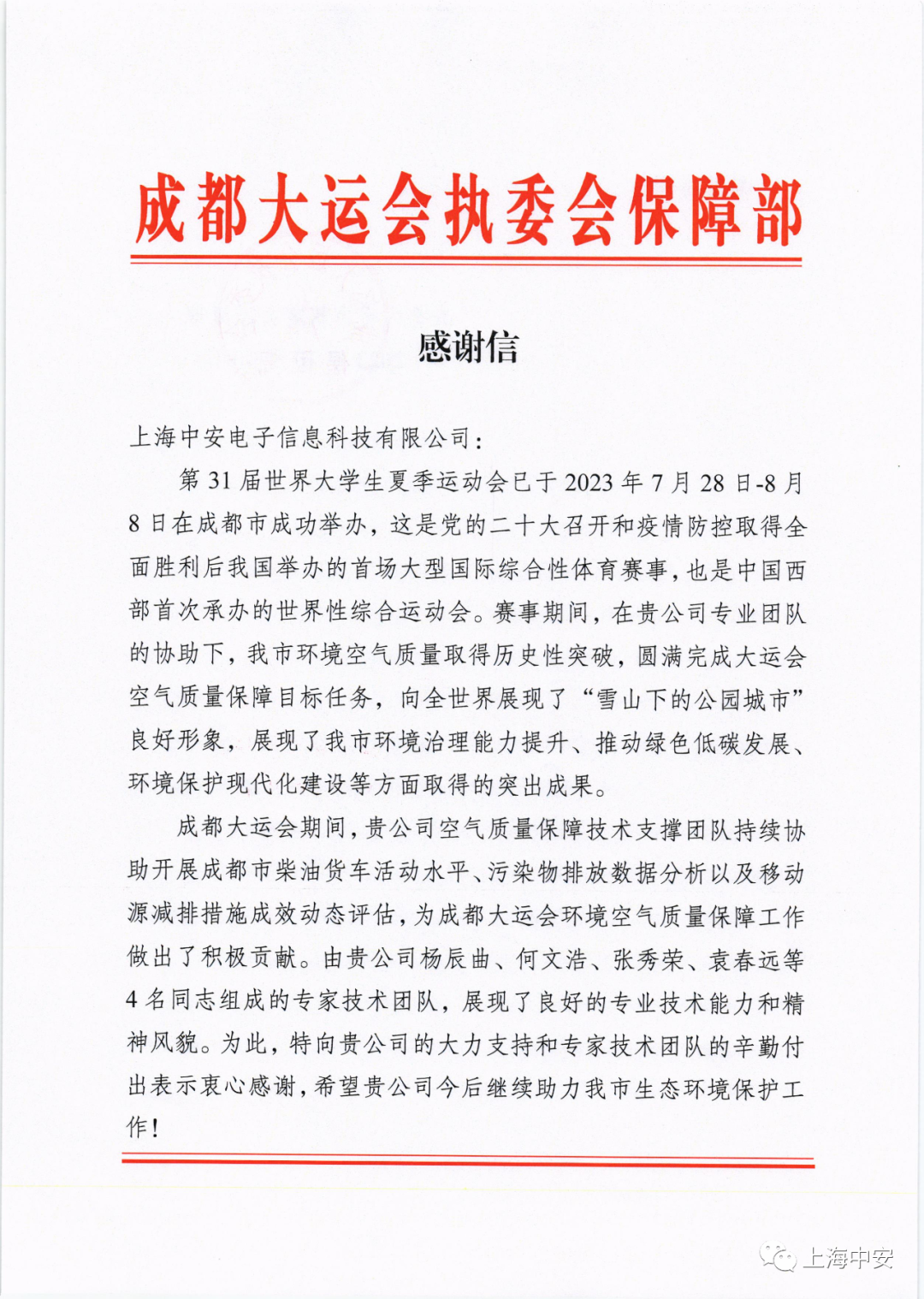 中安科技圓滿完成第31屆世界大學生夏季運動會空氣質量保障任務?。?023-10-9)